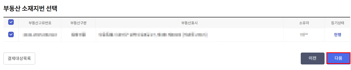 부동산 소재지번을 확인 한 후 다음을 클릭합니다.