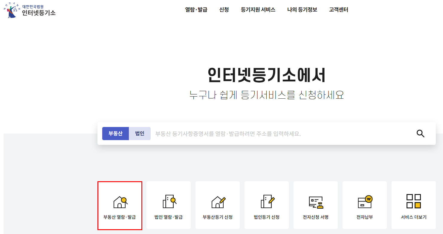- 인터넷등기소 접속 → ‘발급하기’ 메뉴 클릭