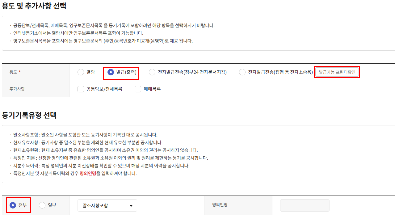 열람용 등기사항증명서는 법적 효력이 없으므로 관공서 등에 제출하기 위한 서류는 발급용으로 출력해야 합니다.