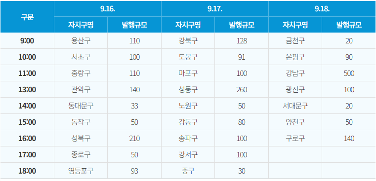 - 9월 16일~18일, 자치구별 발행 시간 꼭 확인